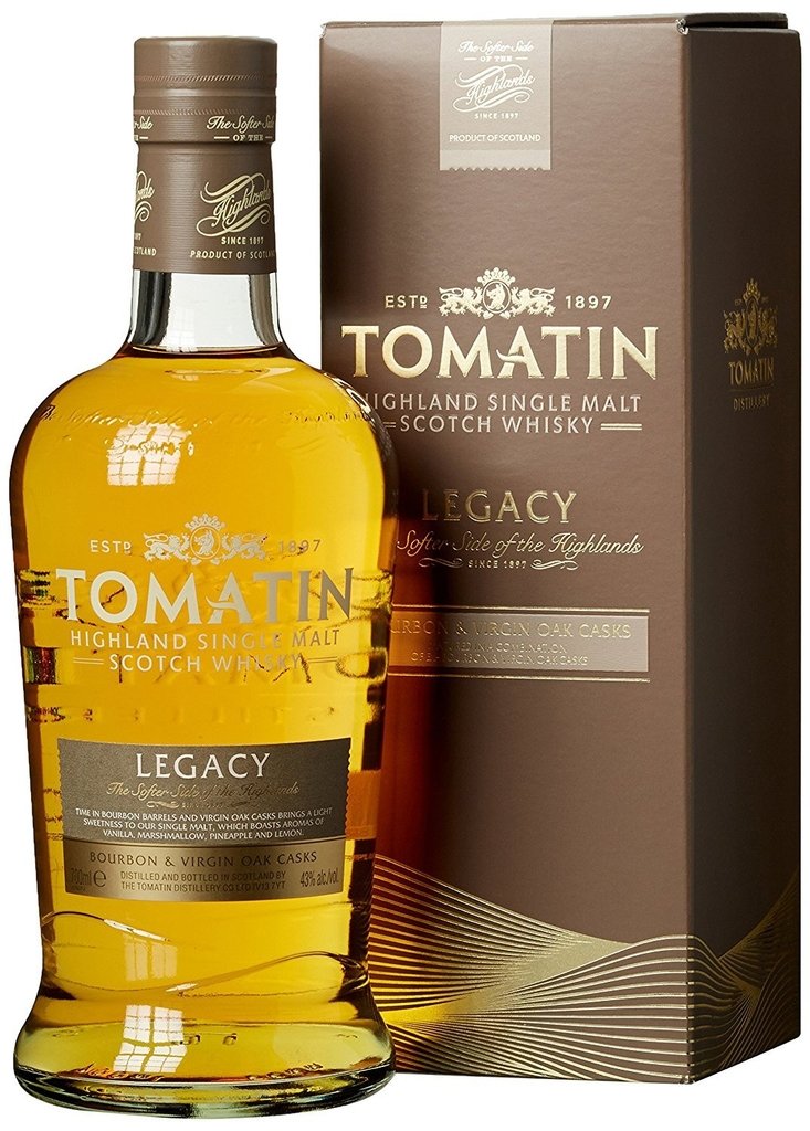 Tomatin Legacy Este whisky es madurado en una combinación de barricas de Bourbon y ex barricas Vírgenes de roble. Es ligero y delicado, de acuerdo con el estilo tradicional destilería Tomatin. El uso de las barricas Vírgenes abrió una dulzura vibrante y atractivo en el paladar.
